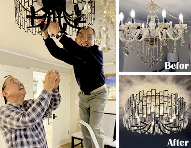 シャンデリアの交換に奮闘する高野さん・副島さんコンビ                                                    上:交換前 下:交換後